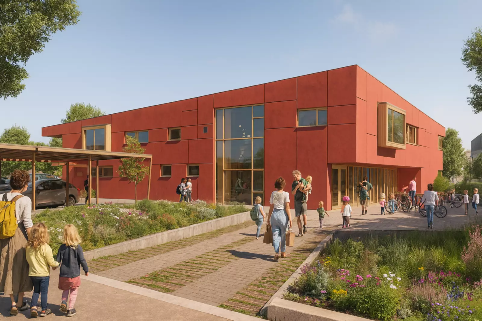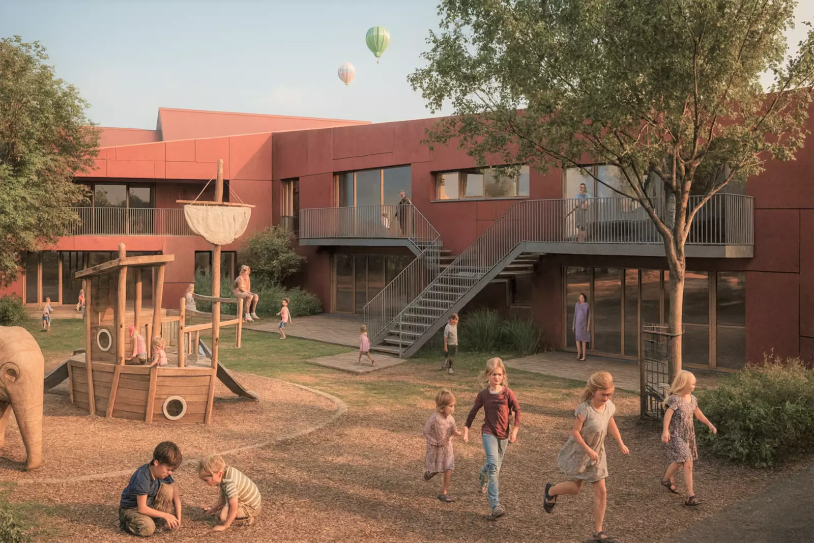 Die gesamte Wohnsiedlung ist autofrei geplant. Der ruhende Verkehr ist in einer Tiefgarage unterbracht, von welcher aus mittels Aufzugsanlagen, alle Wohnungen barrierefrei und altersgerecht erschlossen werden können. Einen weiteren Baustein zur sinnvollen Quartiersentwicklung an diesem Standort, bildet eine Kindertagesstätte mit vier Gruppen, die das Quartier zur Südgrenze hin als selbstbewusster und eigenständiger Baukörper abschließt. Hierdurch werden nicht nur Betreuungsplätze für die Kinder der Neubewohner gesichert, sondern auch eine wichtige Ergänzung des Betreuungsangebotes für den ganzen Stadtteil geschaffen werden.